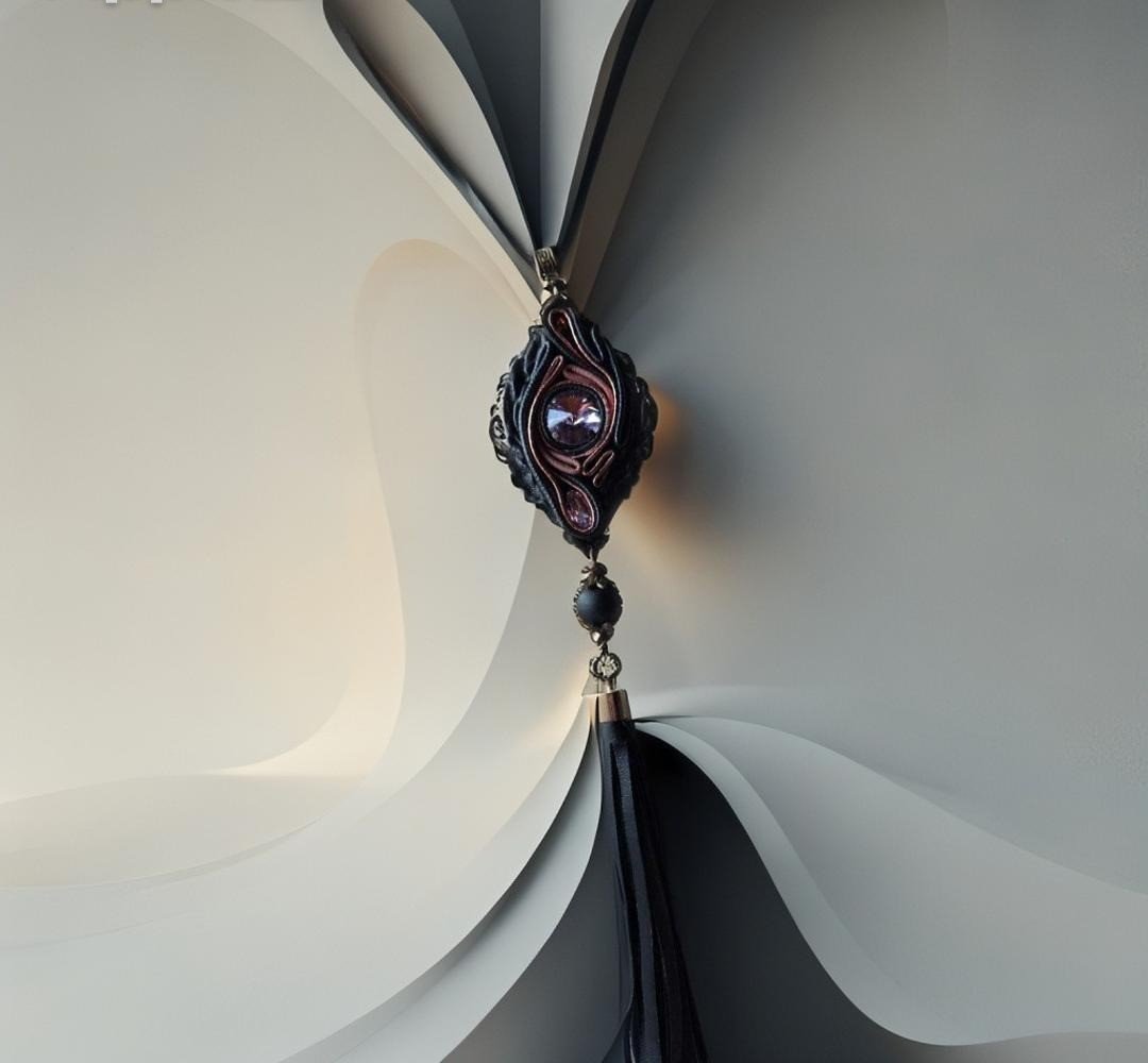 Pakabuko širdis – rankomis suformuotas odinis elementas, kuris apgaubia stiklo kristalą tarsi apsaugantis rėmas. Kiekviena detalė šiame kūrinyje pagaminta su ypatingu kruopštumu: oda kirpta, formuota ir klijuota rankomis, siekiant išgauti tobulą formą bei išlaikyti natūralų medžiagos grožį. Stiklo kristalas įkomponuotas taip, kad subtiliai atspindėtų šviesą – priklausomai nuo apšvietimo, jis gali spindėti švelniomis atspalvių žaismėmis ar sukurti gilaus žvilgsnio efektą.